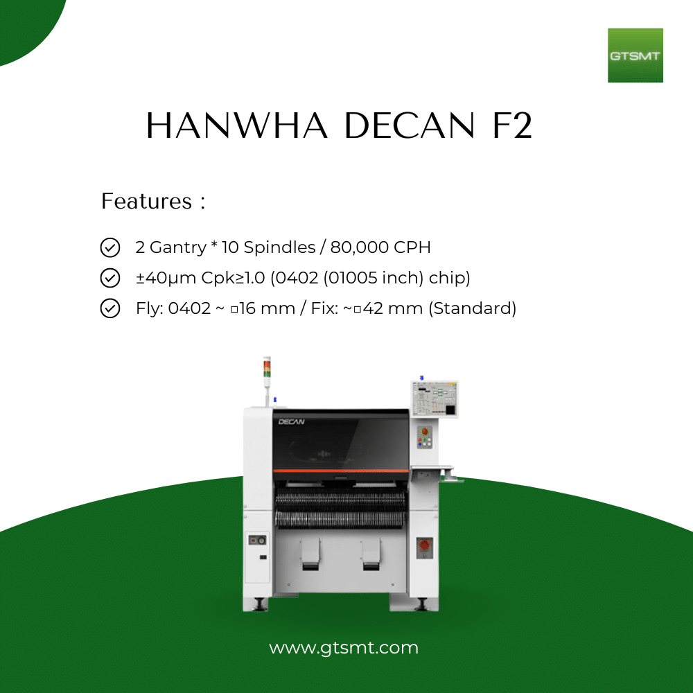 The Hanwha Decan F2 is an outstanding pick-and-place solution for manufacturers seeking speed, flexibility, and precision in their SMT assembly processes. Its cutting-edge technology, speed, and adaptability make it an excellent choice for high-volume production lines requiring the highest level of performance.