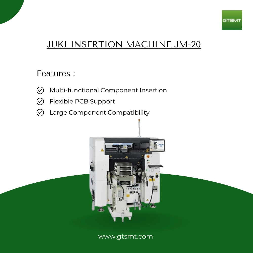 The JUKI JM-20 insertion machine is ideal for manufacturers transitioning from fully manual insertion to automation or those looking to improve efficiency in hybrid assembly lines. Its ability to handle a mix of components with high precision and reliability makes it a versatile choice for industries prioritizing quality and efficiency Juki also offers various types of inserters such as JM 100 which provide high-speed insertion.