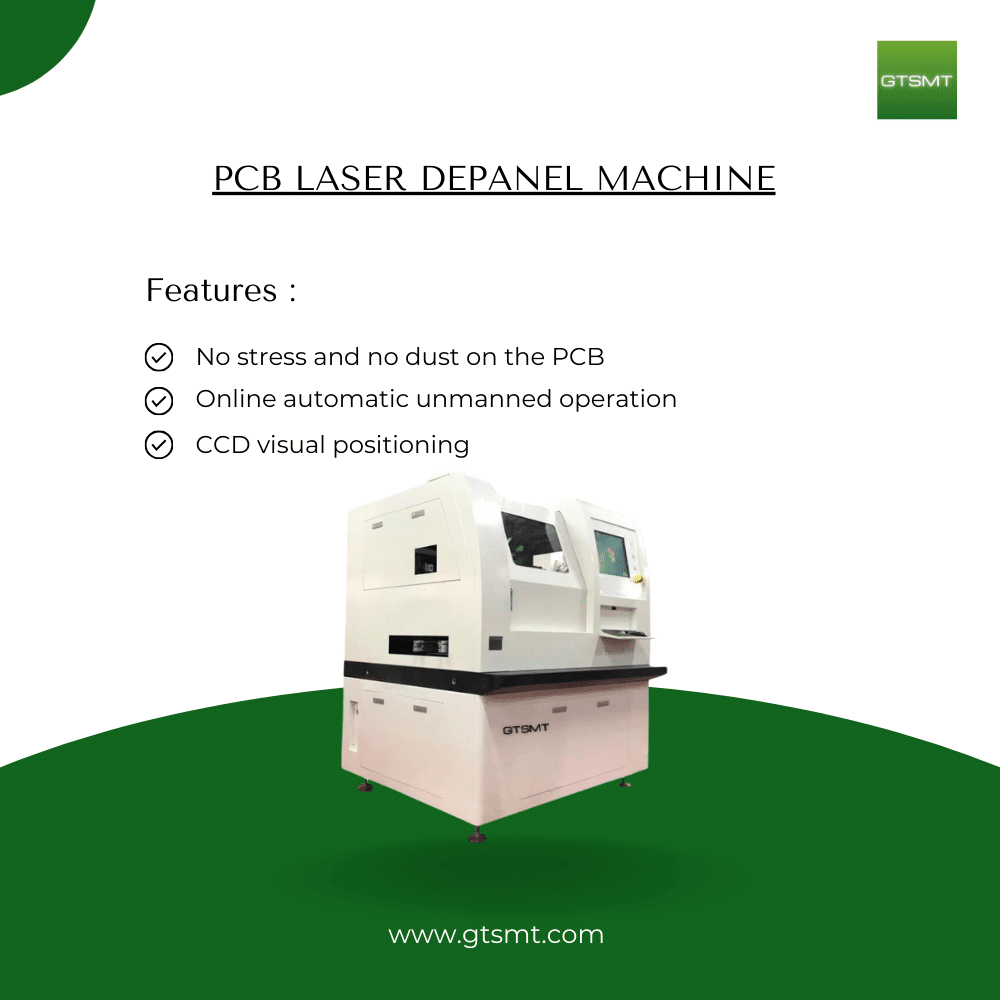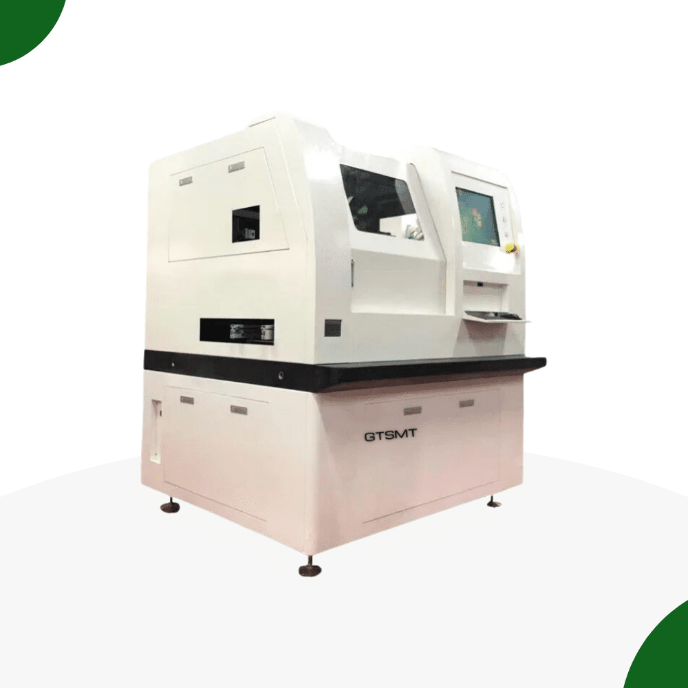 A PCB laser depaneling machine is a high-precision, non-contact system used to separate individual printed circuit boards (PCBs) from a larger panel. Unlike traditional PCB cutting methods such as V-cut, routing, or punching, laser depaneling uses focused laser beams to achieve clean and accurate cuts without mechanical stress or physical contact. This makes it ideal for delicate, high-density, or irregularly shaped PCBs, especially in SMT (Surface Mount Technology) production lines.